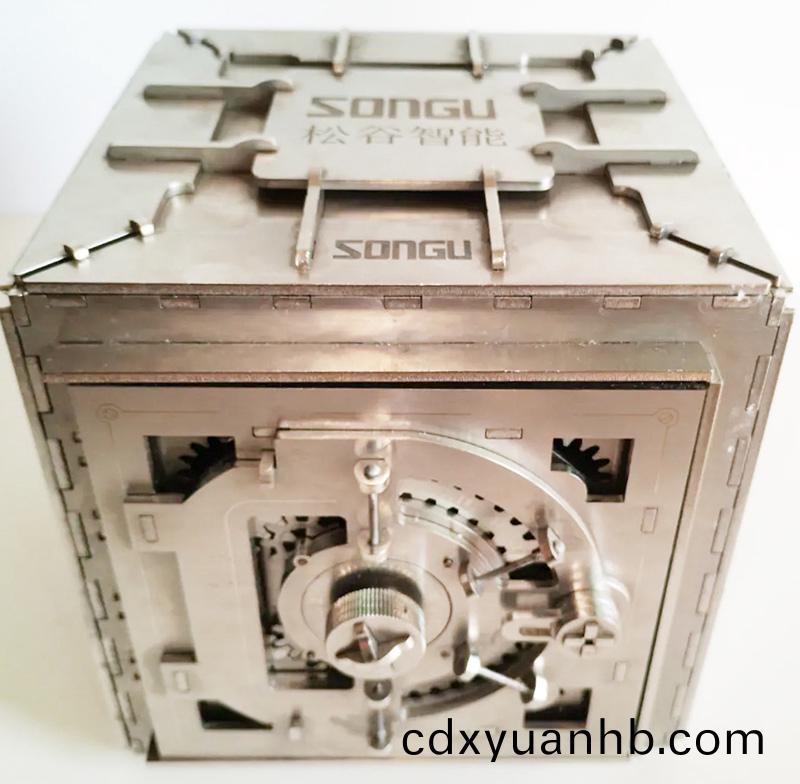 此(ci)次(ci),蘇(su)州松谷激光參賽作品--密碼箱模型--由Wind風速系列光纖激(ji)光切割機切(qie)割(ge)數百塊不同形(xing)狀的板(ban)材、齒輪,齒條等零件,采用榫(sun)卯結構組合而(er)成。復雜(za)程度大,精密程度(du)高。在Wind風速系列光纖(xian)激(ji)光切割(ge)機精細切割下,各零部件間環(huán)環(huán)相扣、緊緊(jin)相連,完美的嵌合在一起。